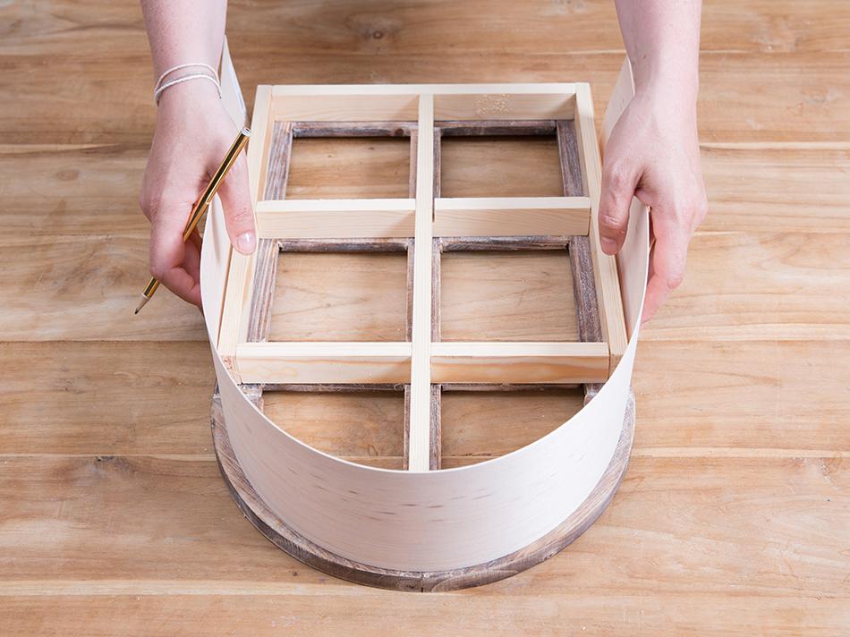 Corta la lámina de chapa de madera a la medida, para colocarla después y ocultar los laterales del jardín vertical. Se fija a la estructura con grapas.