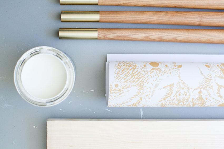Además de la madera, necesitarás: cuatro patas para muebles (en este caso se utilizaron unas de madera), lija, masilla de madera, pintura acrílica blanca, cinta de pintor, papel decorativo, pegamento, tornillos, atornillador eléctrico, sierra de calar (si decides cortar tú las piezas de madera), cúter, metro, lápiz y papel.