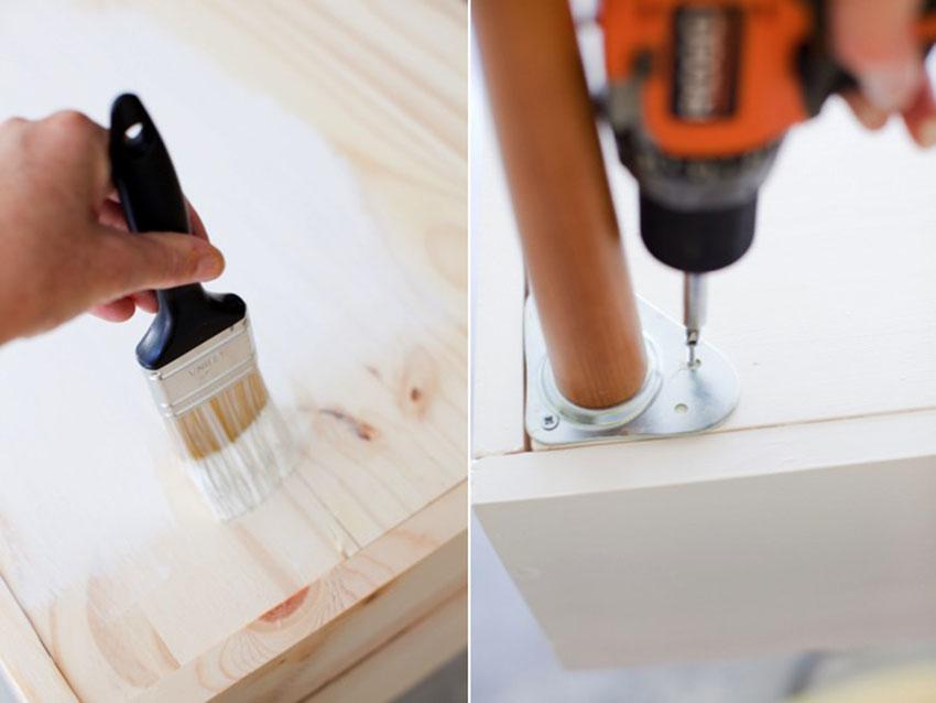 Cuando tengas el cajón montado es el momento de lijar la superficie hasta que quede lisa al tacto. Después tendrás que pintar el exterior con la pintura acrílica blanca. Aplica dos capas, dejando secar totalmente entre ambas.