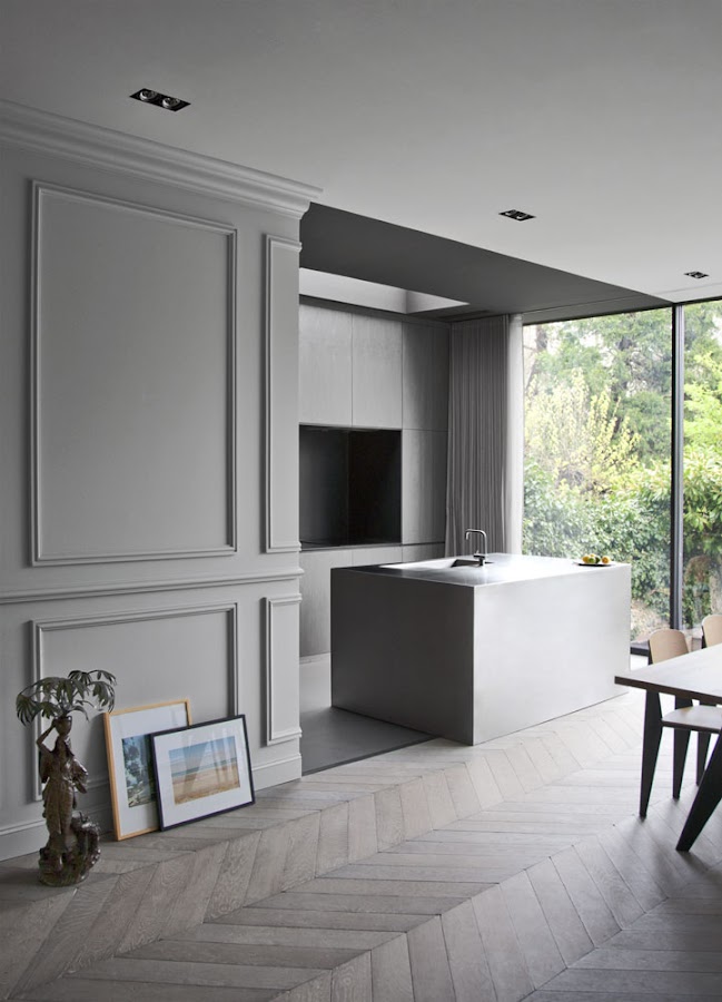 En la vivienda que os mostramos hoy, reformada por el estudio parasino RMGB, han hecho cortes en las paredes decoradas con molduras y han creado una especie de cajas de un material gris oscuro donde se han hecho modificaciones. Nos encanta el efecto de tener un entorno clásico en el que se han cortado porciones delimitando espacios para integrar nuevos usos.