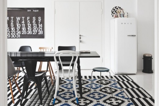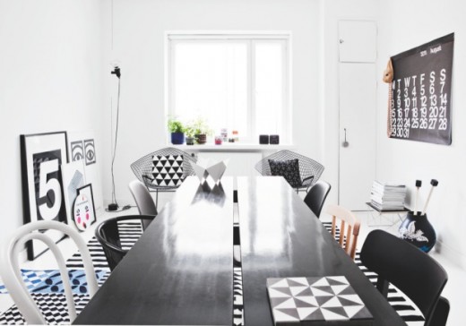 con motivos geométricos, diferentes sillas que aportan al comedor el dinamismo suficiente como para poder considerarlo como lugar de estudio, comedor , mesa de manualidades e incluso para las reuniones con amigos...