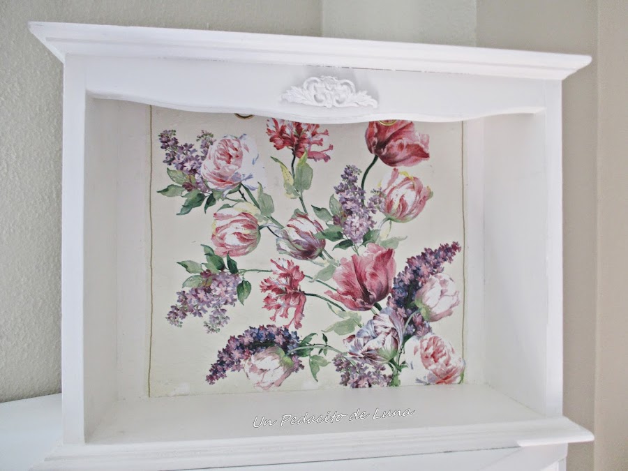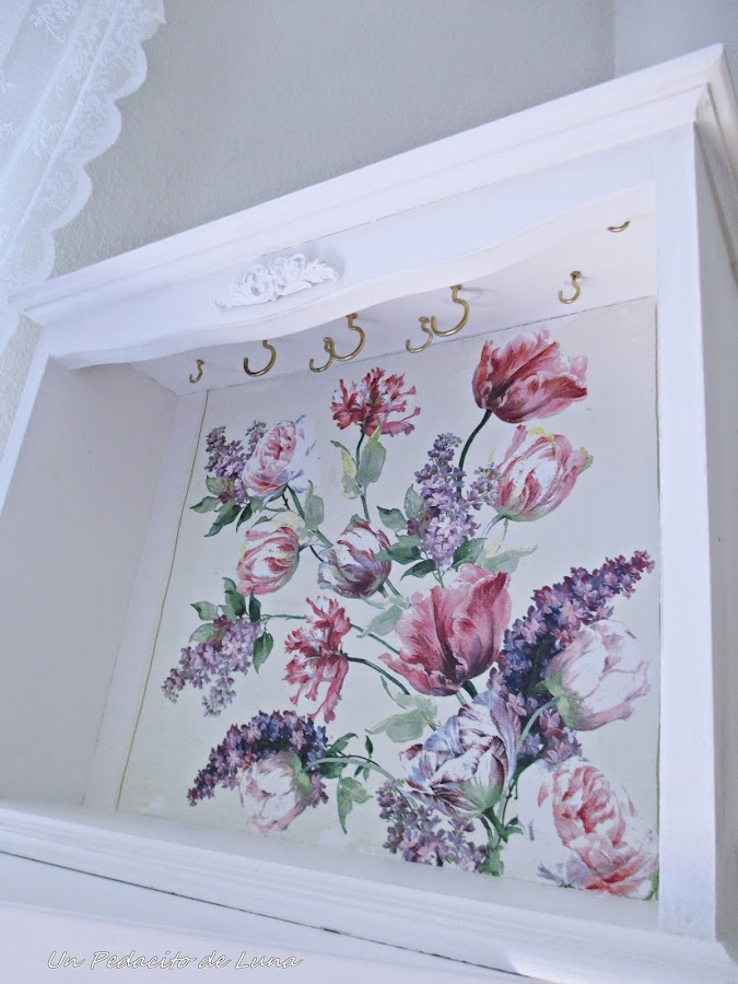 Le di unas manitos de pintura blanca, una linda servilleta como fondo y le apliqué unos ganchos a modo de colgadores y una plaquita de escayola para el acabado final !!