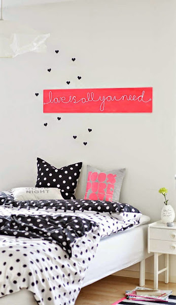 Hoy os traigo las imágenes de un adorable dormitorio en blanco en el que el color lo ponen los alegres stickers de corazones en la pared, el cuadro de madera con letras realizado por su propietaria, y los topos de la ropa de cama, que es de la firma H y M. Una sencilla mesita con lámpara de Ikea , un portavelas y un minimalista jarrón dan forma a un dormitorio en el que el lema es, ante todo la sencillez.