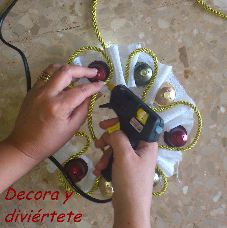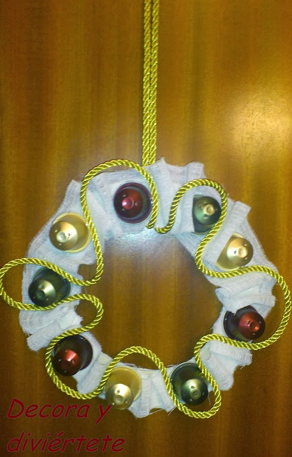 3- Ahora solo falta poner la cuerda , la puedes poner como quieras , a mi se me entojo pasarla entre las cápsulas de Nespreso haciendo una especie de zig-zag . Tienes que tener en cuenta que tienes que dejar un trozo de cuerda para colgar la corona en alguna puerta .