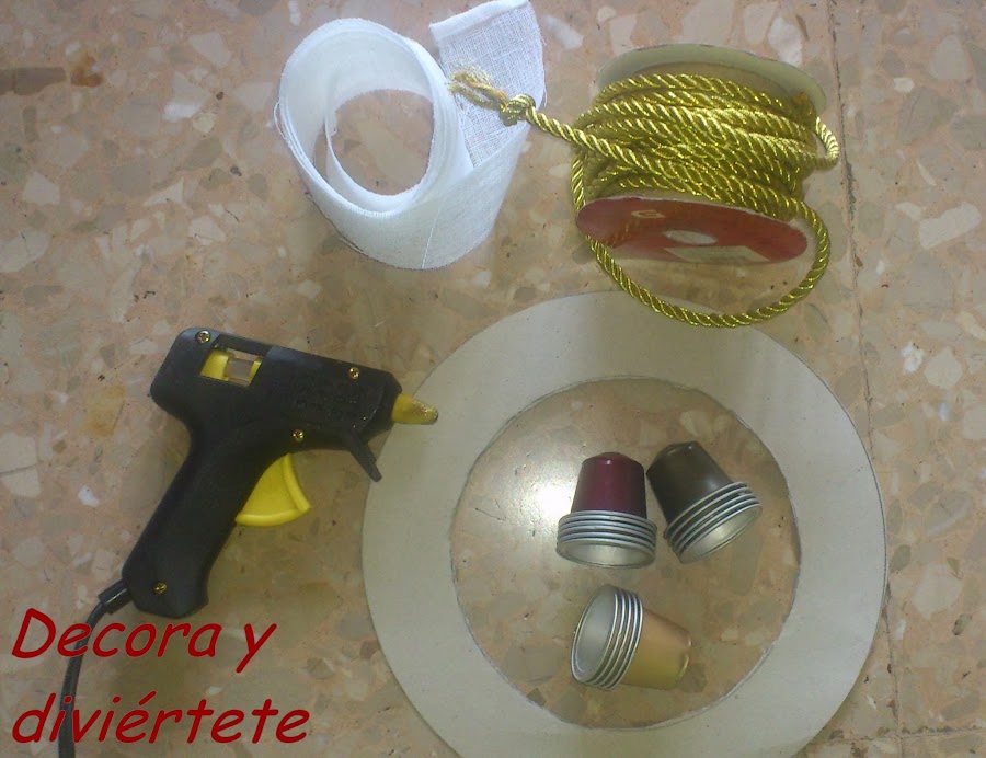 Yo por mi parte , estuve buscando cosas que tenía por casa y encontré un trozo de cortina , las cápsulas de Nespreso , un trozo de cartón y una cuerda que ya utilicé en la manualidad cruzada de http://www.decoraydiviertete.net/2013/11/diy-tutorial-adorno-navidad.html y este es el resultado :