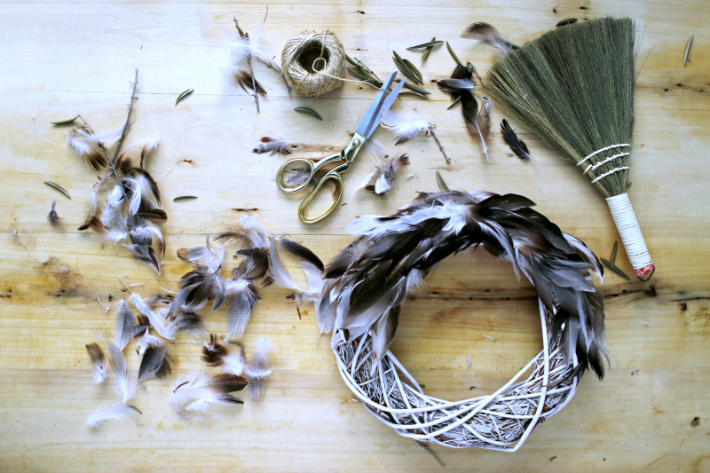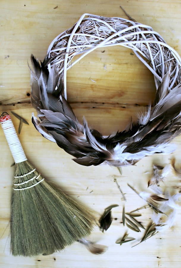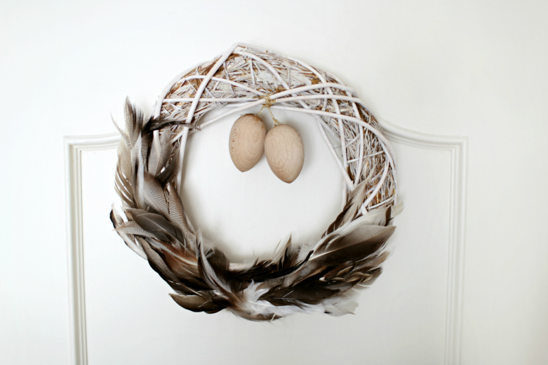 Saqué las plumas, los huevos de distinto tipo que tenía guardados de Pascuas anteriores y una corona de paja y mimbre de las varias que tengo en casa desde tiempo inmemorial y que son la base perfecta para decorar en Navidad o Semana Santa.