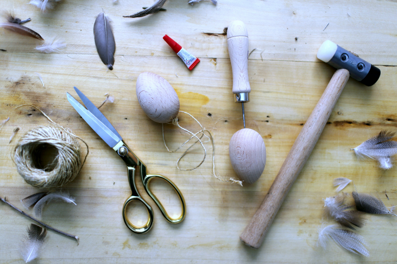 De los huevos que tenía y puesto que buscaba un aspecto sencillo y muy natural he elegido dos en madera a los que he practicado sendos agujeros con un punzón en el lado menos apuntado, introduciendo en ellos los extremos de un trozo de cordón de hilo rústico que he fijado con un poco de pegamento de contacto rápido.