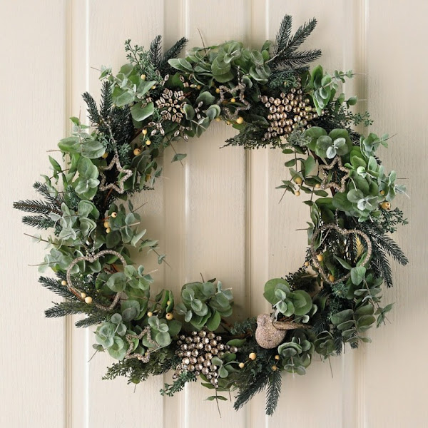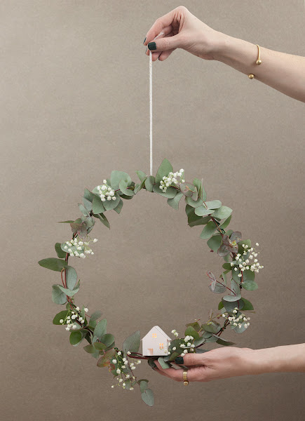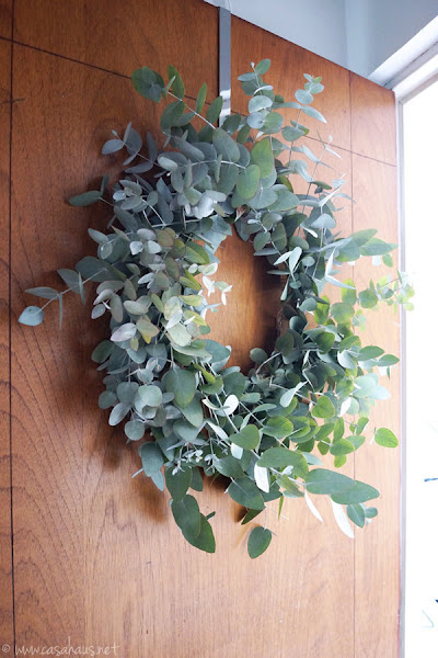 Me encanta el eucalipto, ya no solo por su olor... que me recuerda mucho a Galicia y me da muy buen rollo, sino también por su delicadeza y elegancia. Además es una corona que no es válida sólo para épocas festivas como en la que nos encontramos ahora, sino simplemente para decorar. Combina perfecta con otras plantas también olorosas como puede ser el enebro o incluso la paniculata, como la corona que os he puesto de ejemplo en el inicio.