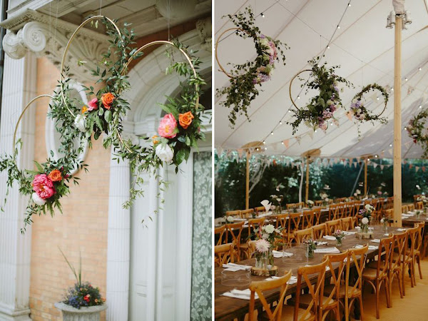 Y por supuesto, multitud de espacios en cualquier tipo de evento: coronas de flores colgadas del techo o de los árboles a modo de cascada, en las zona de la ceremonia, como photocall, en las sillas...Además, con un poquito de maña podéis hacerlas vosotras mismas, usando alambre, bases específicas para coronas florales o incluso hula hoops tuneados ¿Os atreveríais?