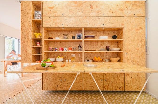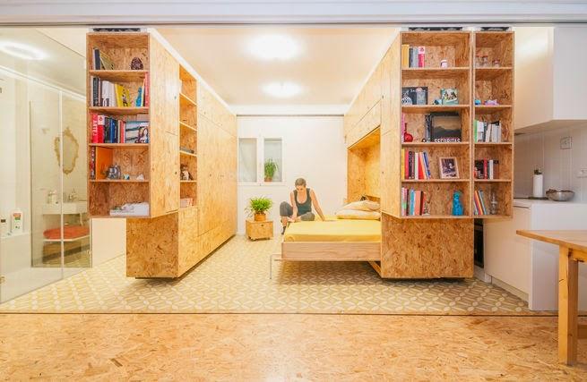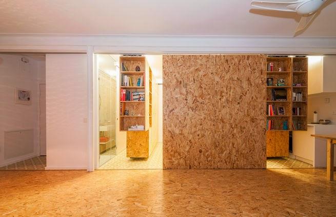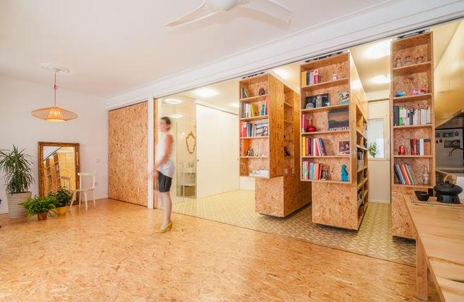 Cortar y pegar........ es el juego ideado por PKMN Madrid para en un solo espacio configurar diferentes estancias , dormitorio , cocina , habitación.... , moviendo fácilmente las estanterías modulares, ideal para pequeños espacios.