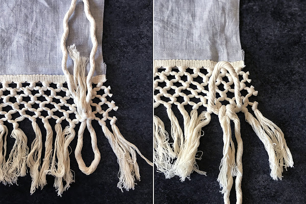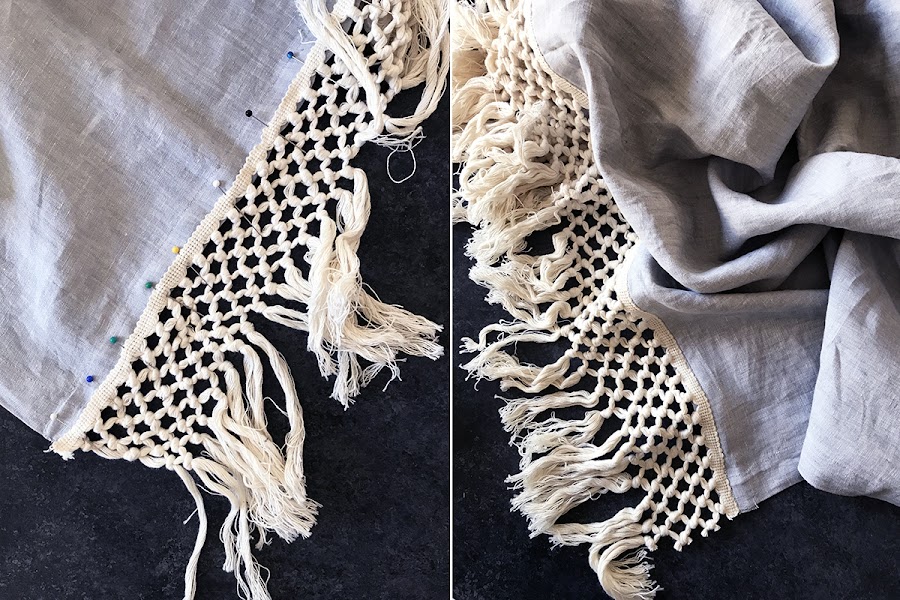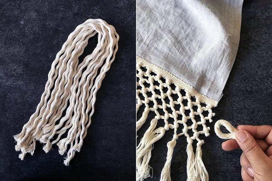 Necesitaréis también una tira de cenefa de macramé que tanto se lleva ahora y cuerda del mismo tono para añadir a la cenefa.