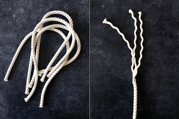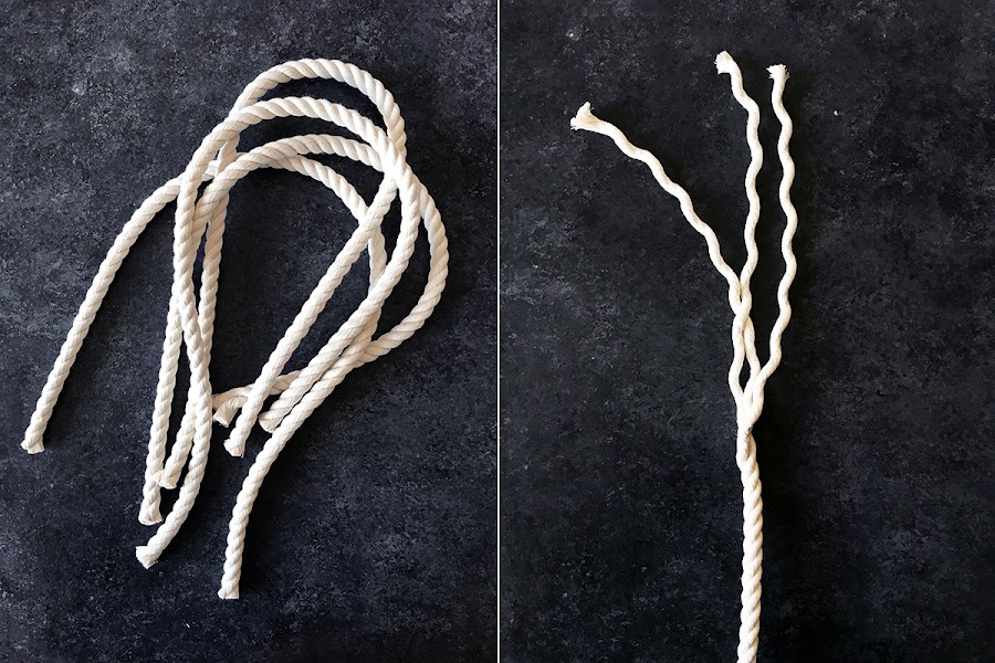 La cuerda en este caso se ha deshecho en tres para conseguir además de que sea más fina, un pequeño efecto rizado. Si sois mañosos y disponéis de máquina de coser tan solo hay que coser la cenefa a la cortina con el pespunte elegido y añadir las cuerdas a base de nudos con lo que conseguiréis además el largo deseado.