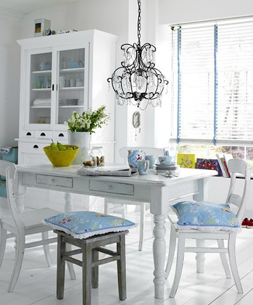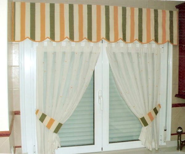Otro tipo de solución, también a la hoja de la ventana pero un poco más "moderna" que el tradicional visillo es la de utilizar estores confeccionados en telas translucidas, de forma que tamicen la luz natural ocultándonos de las miradas ajenas pero dejando entrar la claridad. Los que os enseño en las imágenes son estores tipo paquetto, una evolución de los antiguos estores con varillas y telas gruesas, que en este caso se rematan en el bajo con unas ondas, dándole un toque más romántico al acabado, de forma que complemente las del bandó realizado con una tela con un estampado de macetas.
