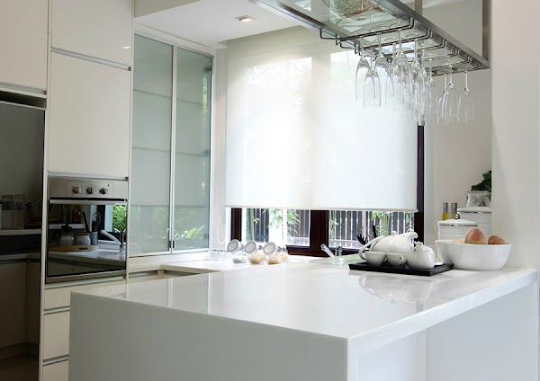 Para aquellos a los que el screen les parece algo frío, pero que también apuestan por la comodidad, la solución perfecta son los enrollables estampados sobre tejidos translúcidos que tienen un tratamiento impermeable y anti-manchas que los hacen perfectos para las cocinas. Además del atractivo de los estampados en sí - normalmente son dibujos o letras -, este tipo de enrollable aporta más calidez y color a los ambientes y, como en el caso del screen, basta con pasar un paño húmedo para limpiarlos y mantenerlos tan bonitos como el primer día. A la hora de colocarlos, podemos optar por hacerlo directamente o, como se puede ver en la primera foto, tapar la parte superior del rollo con una caja metálica.