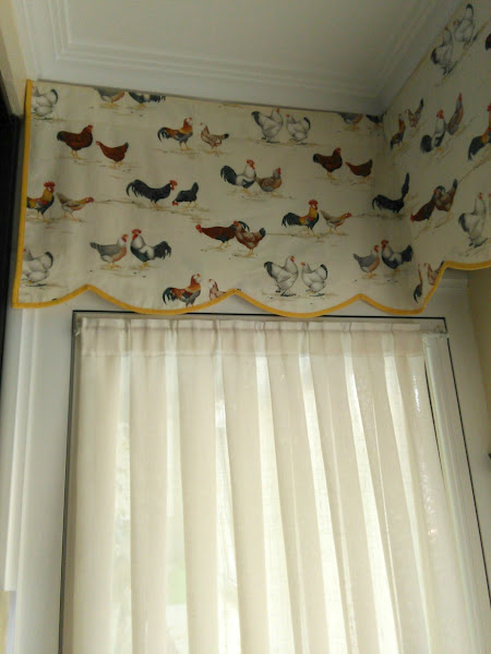 En el caso de las cortinas propiamente dichas, o visillos como seguramente los llamáis much@s de vosotr@s, el sistema de instalación es el mismo - van sujetos al marco de la ventana con unas barritas adhesivas -, pero el acabado final varía en función de la confección elegida. Una opción es hacerlos fruncidos, como los de la primera imagen, para después recogerlos a los lados con un lazo en tela rosa lisa a conjunto con la elegida para el bandó que, en este caso, se ha confeccionado con pliegue americano. Otra opción es confeccionar las cortinas a palas o tablas y con trabillas, y de nuevo, recogerlas con un lazo de tela de rayas a juego con el bandó que, en este caso está confeccionado en recto con ondas en el bajo. Una tercera opción puede ser realizar los visillos con tablas, pero sin trabillas, como en el ejemplo que vemos en la tercera imagen donde, bajo un bandó del mismo tipo - recto con ondas - realizado en una tela estampada con gallos y gallinas, encontramos unos visillos que, esta vez, caen cubriendo toda la ventana sin que ningún lazo las recoja a los lados.