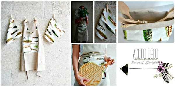 Además, vuestra participación en esta edición de #DiarioDeco tiene premio. El blog ganador se llevará un kit de cocina de AcotíoDeco - Decor & LifeStyle, la tienda de nuestra compañera Anabel que, de entre su variedad de productos hechos a mano para la cocina, ha preparado para vosotr@s un conjunto compuesto por un delantal, dos servilletas y una cesta-panera con estampado de plumas, además de una tabla a elegir, que son una auténtica preciosidad.