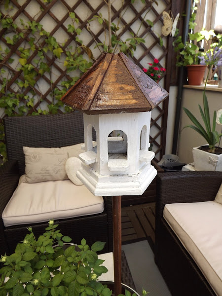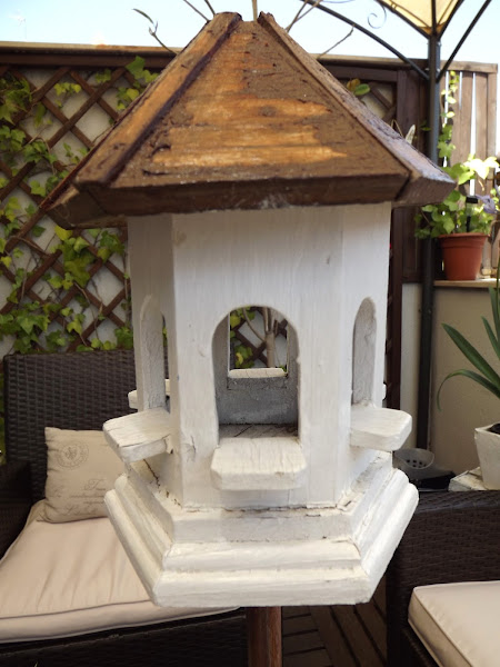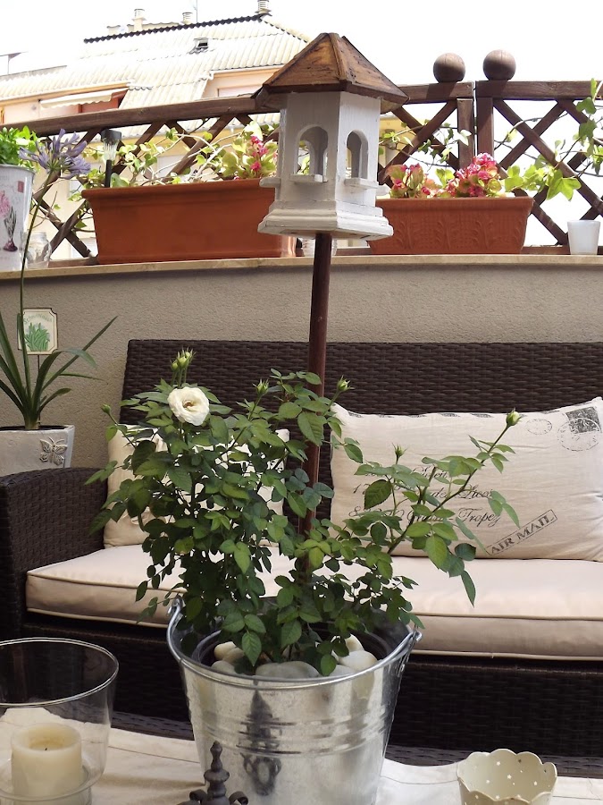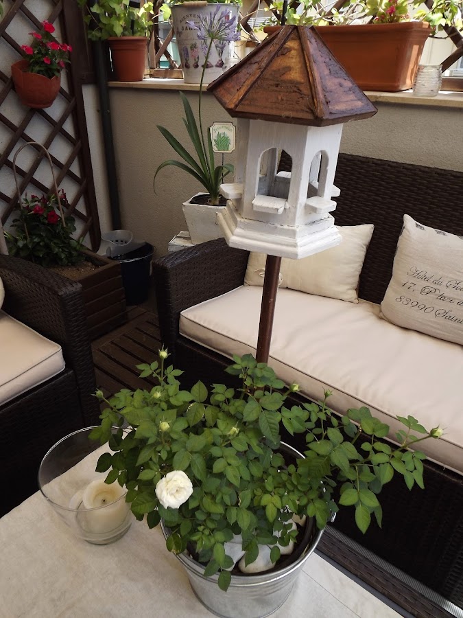 El que si que permanece a pleno sol porque no le supone ningún problema es el rosal recuperado con su casita de pájaros pinchada en él ...