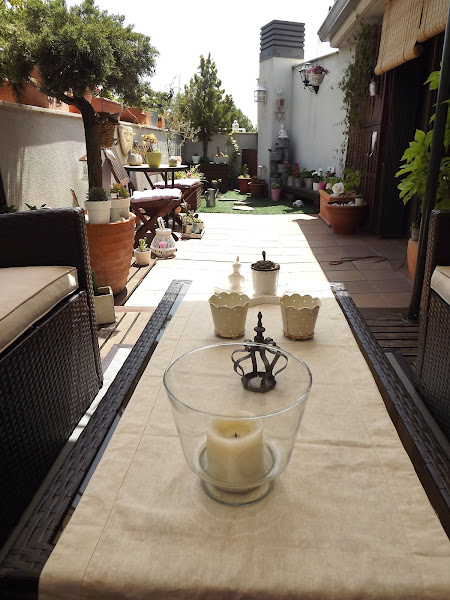 Como mi nuevo camino de mesa extendido sobre la mesa de ratán bajo el cenador. Está pensado únicamente para colocarlo cuando nos tomemos algo al aire libre protegiendo el cristal de la mesa. Creo que queda mucho mejor sin él, sin embargo mantenerlo puesto es ideal para no tener que estar limpiando el cristal de manchas continuamente...