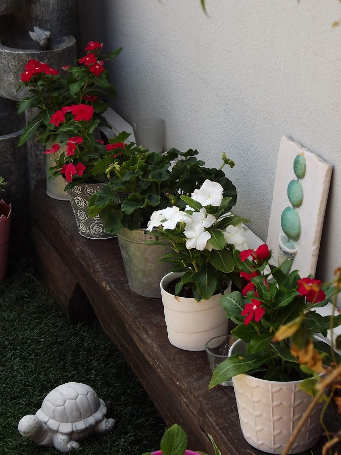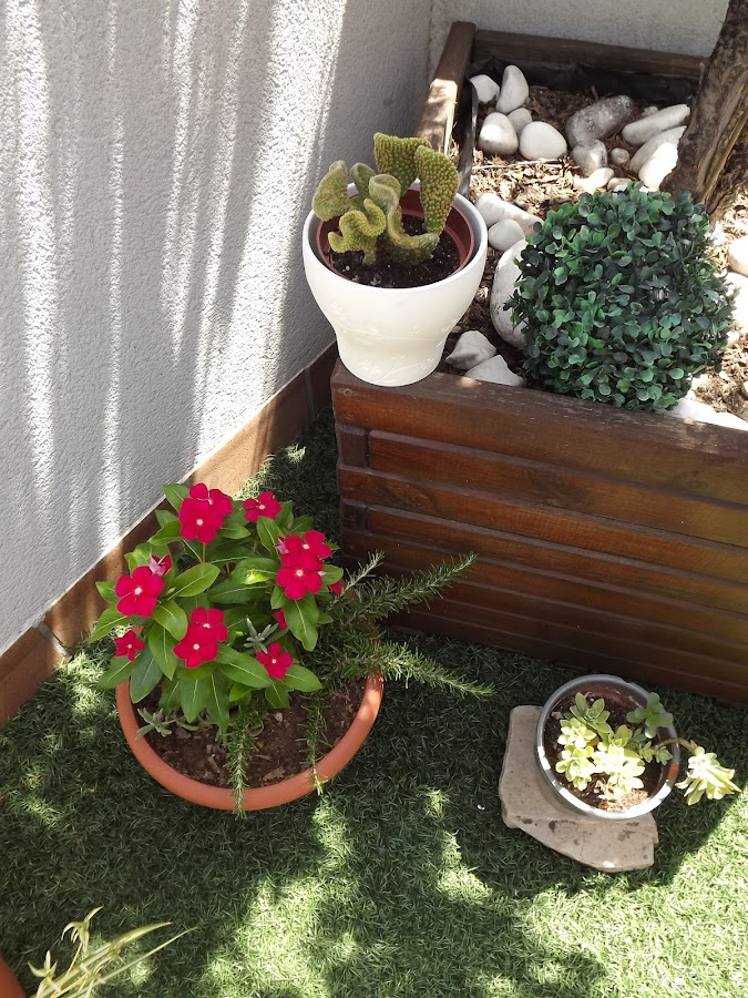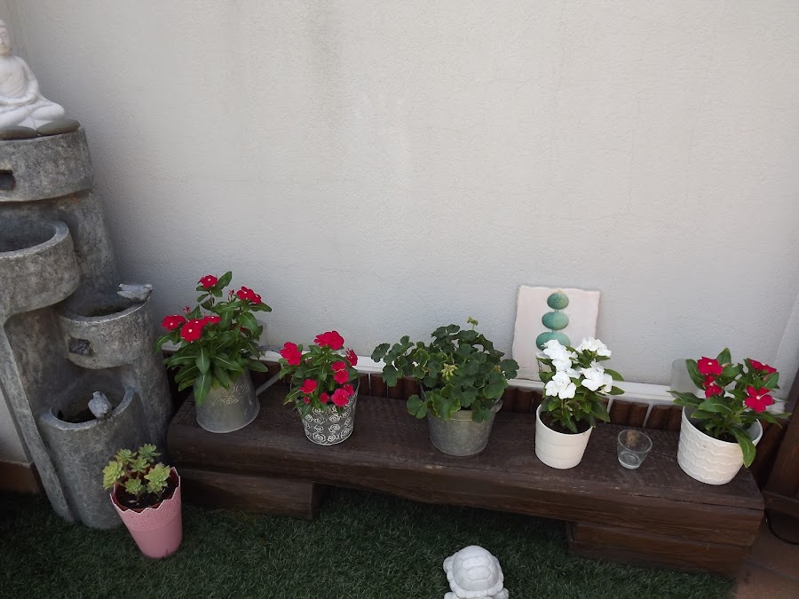 Mis coloridas vincas están preciosas, pero yo las mimo un poquito más refugiándolas del fuerte sol que marchita sus flores de manera fulminante. Para ello en las horas más fuertes del día las coloco en sombra, todas juntas, para así no tener que regarlas varias veces al día y conseguir que no se marchiten del todo...