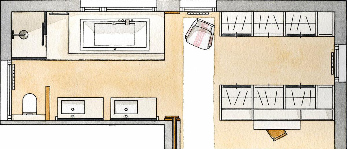 Vestidor en L. Ocupa dos de las paredes del dormitorio. Esta distribución nos permite crear dos espacios separados, por lo que es perfecto para una pareja, pero también para una sola persona que decida tener, por ejemplo, la ropa a un lado y los zapatos a otro.
