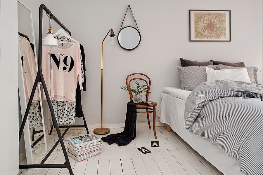 Sencillez en la elección del mobiliario y decoración, aunque algunas de la piezas que componen este dormitorio son de diseño, como la silla Thonet y el espejo Adnet, intentaremos crear una atmósfera similar con elementos alternativos y un sencillo diy que encontrarás al final del post.