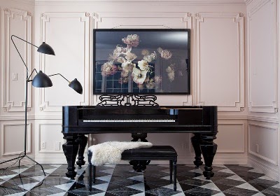 ¿Cómo transformar una sala aburrida y pasada de moda en algo Chic y a la vez desenfadado? Eso es lo que debió pensar la interiorista Christine Dovey cuando le hicieron este encargo... Y hoy, que tenemos un día gris y triste por aquí, pintar la vida de color de rosa y poner algunos toques de brillo y humor no estaría nada mal... Tendremos que conformarnos con esta sala de piano que, aunque la mayoría no tenemos una como esta, sí podemos aprender cómo la paleta de colores rosa pálido, negro y dorado nos trasladan a un mundo de lujo y belleza, y la importancia de decorar las paredes para que parezcan incluso más altas (sólo hace falta ver las imágenes del antes y el después... sin comentarios, jejeje!!!). Feliz lunes!!!