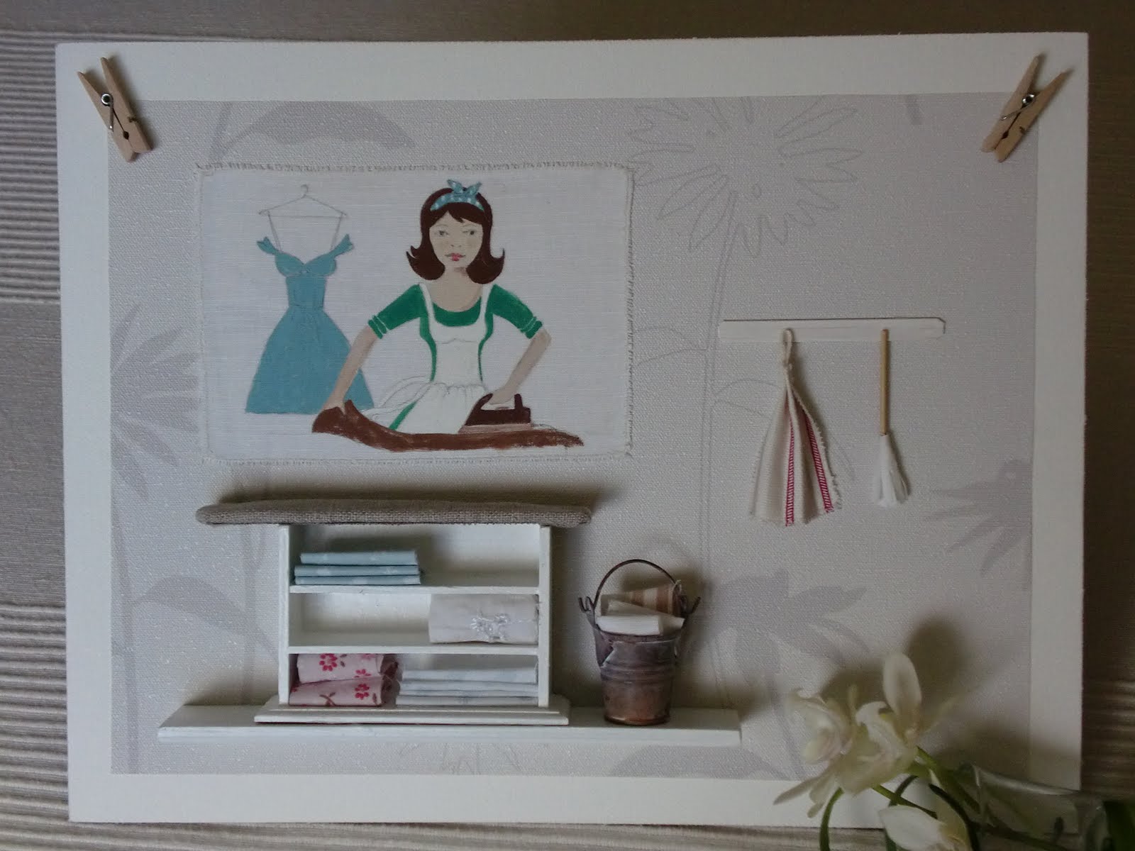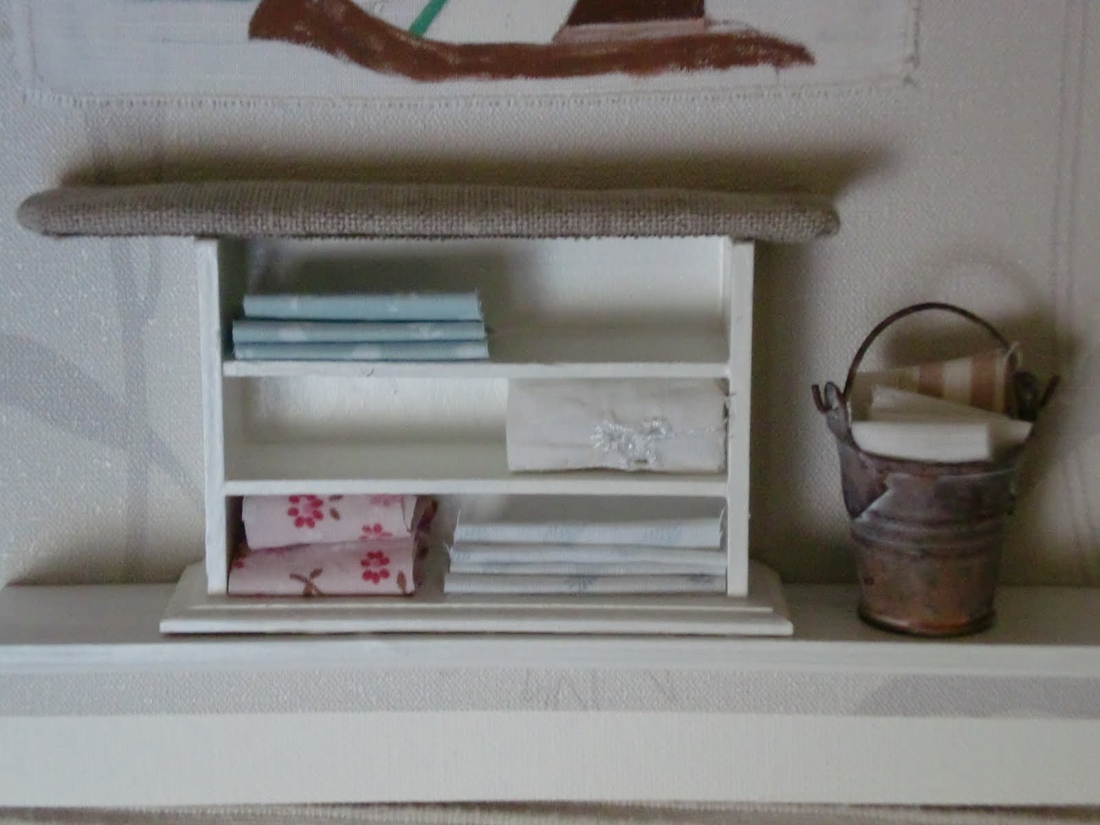 Pues con esos datos y un poquito de imaginación, se me ocurrió que la tabla de planchar no podía ser convencional y manos a la obra le he hecho un tabla mas actual, con sus estanterías para poner la ropita doblada. No quería tampoco ponerle una lámina de papel, así que decidí pintar yo una muchacha planchando.