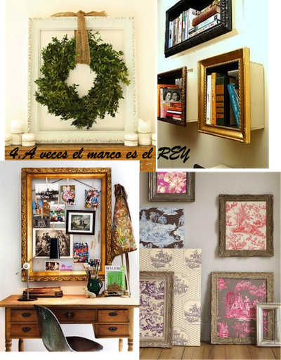 A veces el marco es el rey: Muchas veces nos ocurre que tenemos un marco precioso, pero no tenemos cuadro para ponerlo. Eso ahora no es problema, podemos colgarlo "vacío" en la pared, poner algo en relieve dentro de él (un recuerdo de infancia, tus primeras gafas, tu primer reloj?), poner una tela bonita que lo complemente, o buscar una lámina simple que lo llene pero no le quite el protagonismo que merece. Hay muchísimas opciones! ¿Se os ocurre alguna?