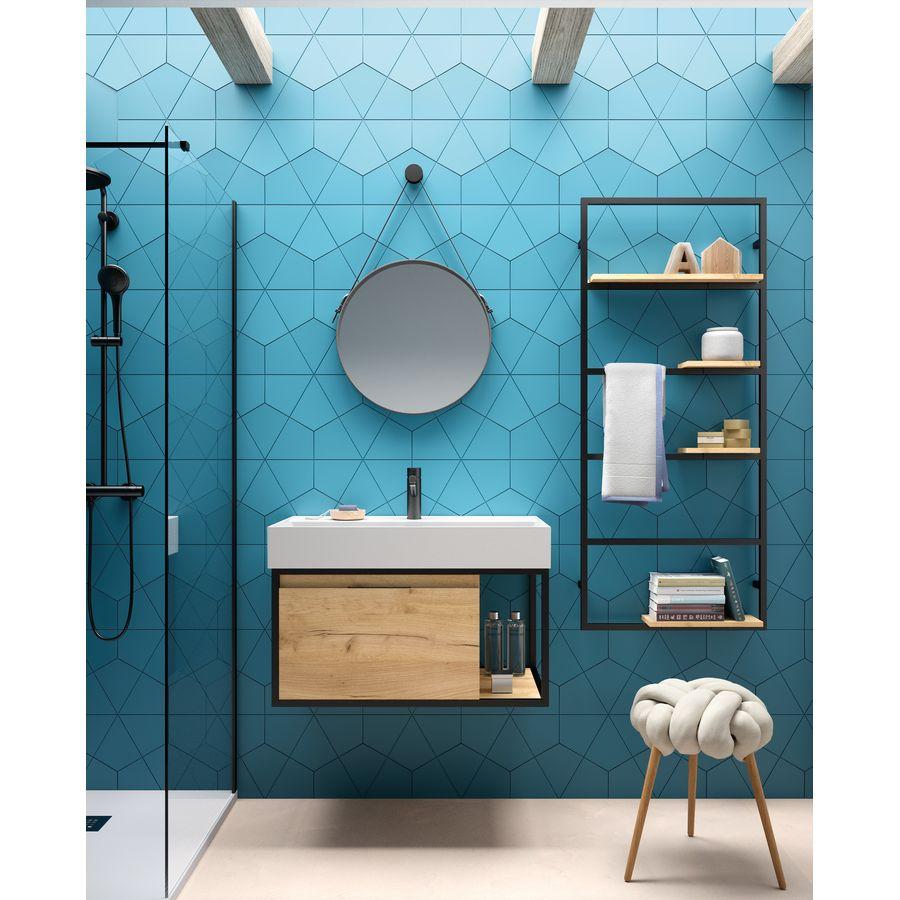 Vinci tiene un marcado estilo funcional que se refleja en cada uno de sus elementos. Por ejemplo, la estantería de la serie cuenta con cuatro estantes que se combinan con espacios para colgar las toallas. El espejo estilo barbero con su forma circular, colgador y marco con correa simil cuero es perfecto para dar vida al estilo industrial, así como la mampara Heaven Black que con su cristal transparente y su perfilería en negro.