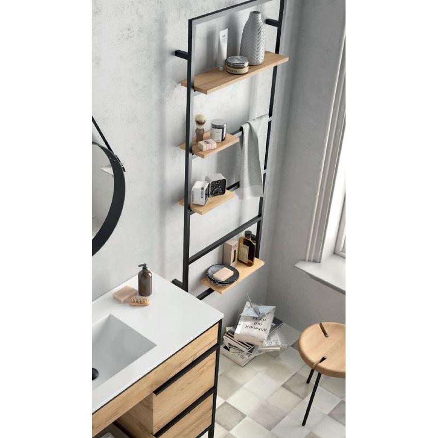 Conjunto compuesto por estructura Vinci en aluminio lacado negro mate con balda en Roble áfrica , patas y toallero reversible con lavabo cerámico Veneto .