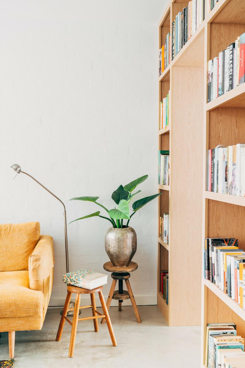 Los revestimientos, con pintura en blanco y los suelos de hormigón, son los protagonistas para dar amplitud y continuidad a la casa, pero después entran en juego todos los elementos de contraste, como la librería de madera que preside el salón.