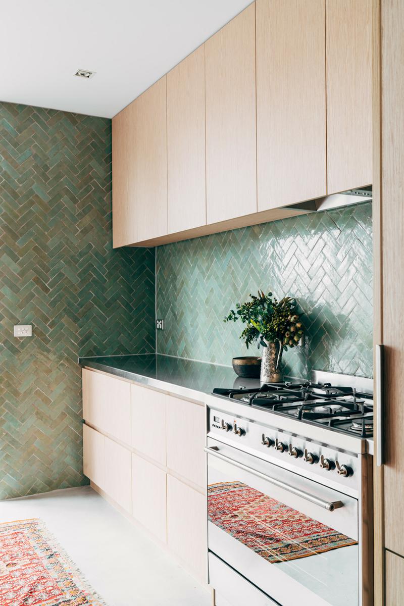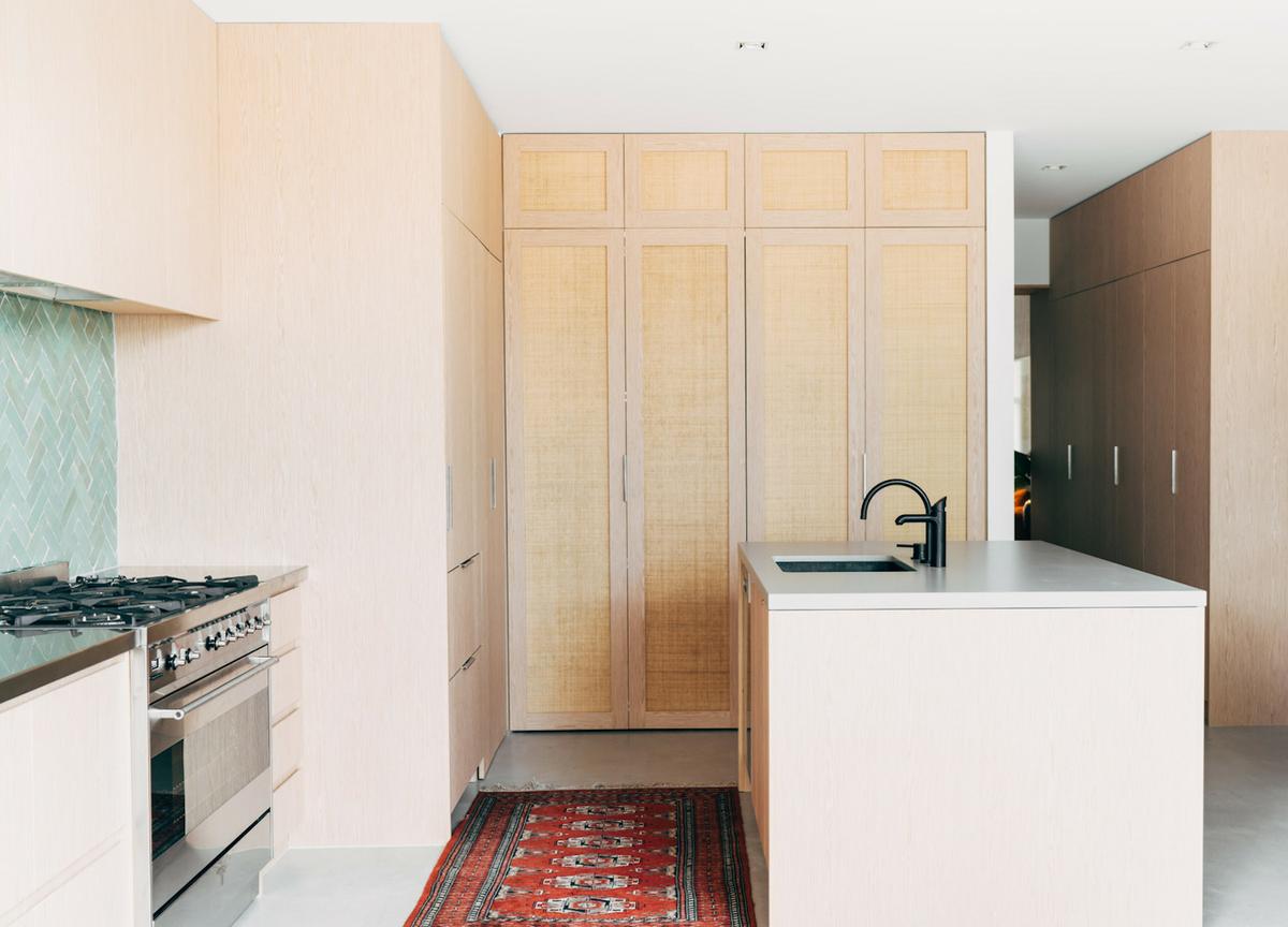 Otro ejemplo es la cocina, que se reviste con azulejos en verde agua insertados en forma de espiga, rompiendo así las líneas más rotundas del alicatado horizontal. En continuidad con el mobiliario de fresno, algunos armarios se revisten con tejido de bambú (una versión en papel pintado que últimamente me atrae bastante… mmmm… tengo que preparar un post sobre esto).