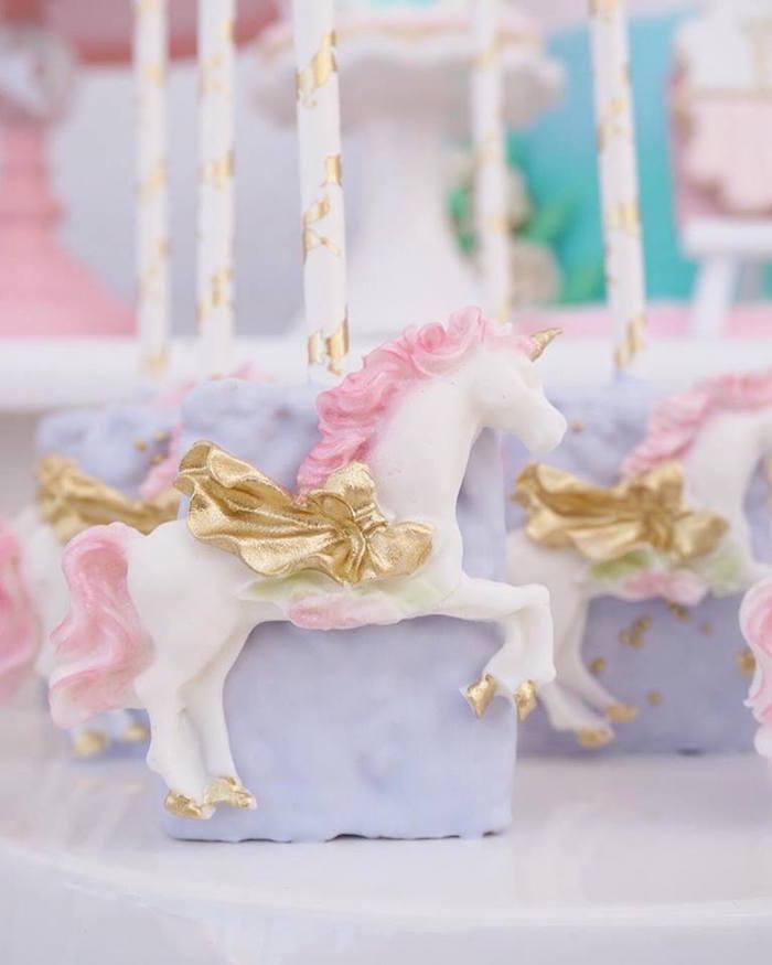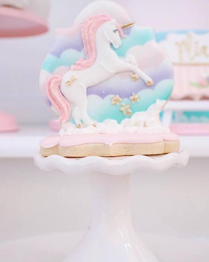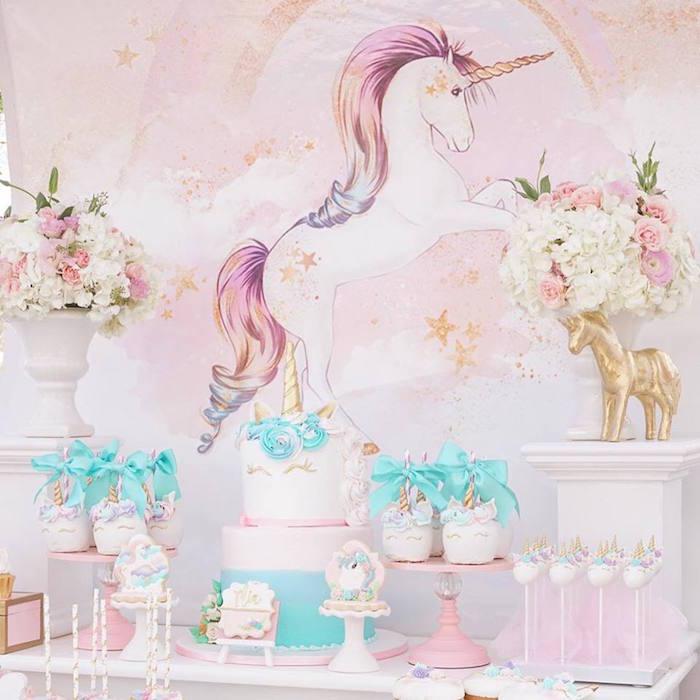 Las fiestas de Unicornio nos permiten versionar colores y estilos sin apartarnos de su esencia. Darle un toque vintage, floral, infantil con colores fuertes o como en este caso, que me ha encantado, utilizar colores pastel con pinceladas doradas y algunos toques florales