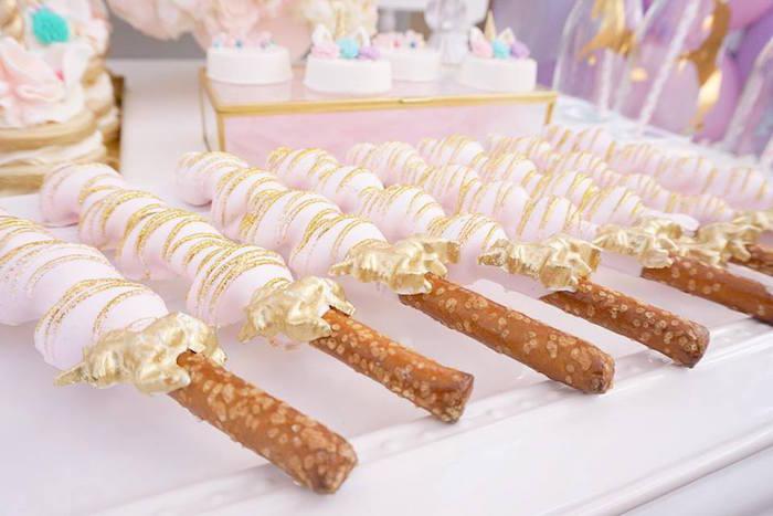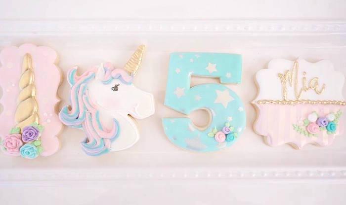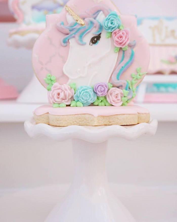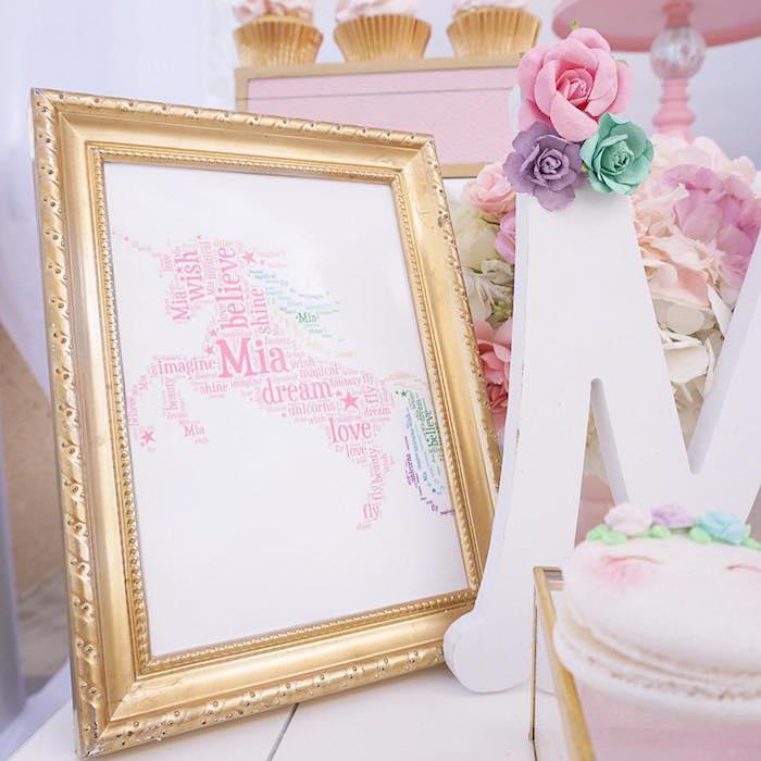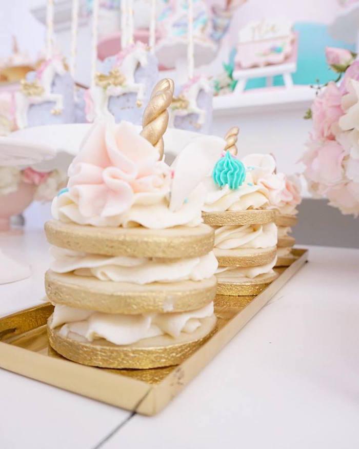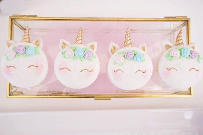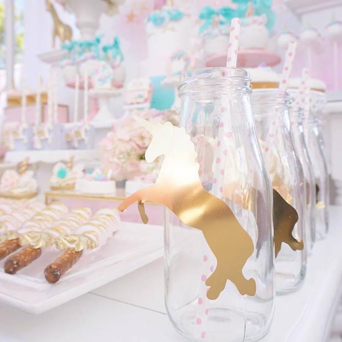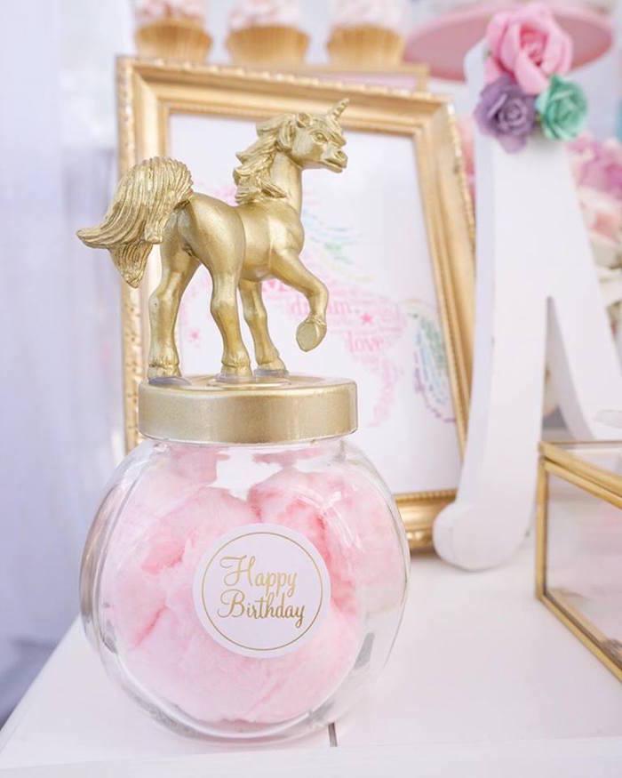 Detalles como las botellas con los unicornios en dorado, la inicial decorada con pequeñas flores, el cuadro personalizado, los tarros de chuches con los unicornios pegados (yo lo uso mucho en mis fiestas adaptándolos a las temáticas), y los joyeros y las mini stands en dorado y cristal para las galletas individualizadas, me parecen de lo más fino y elegante