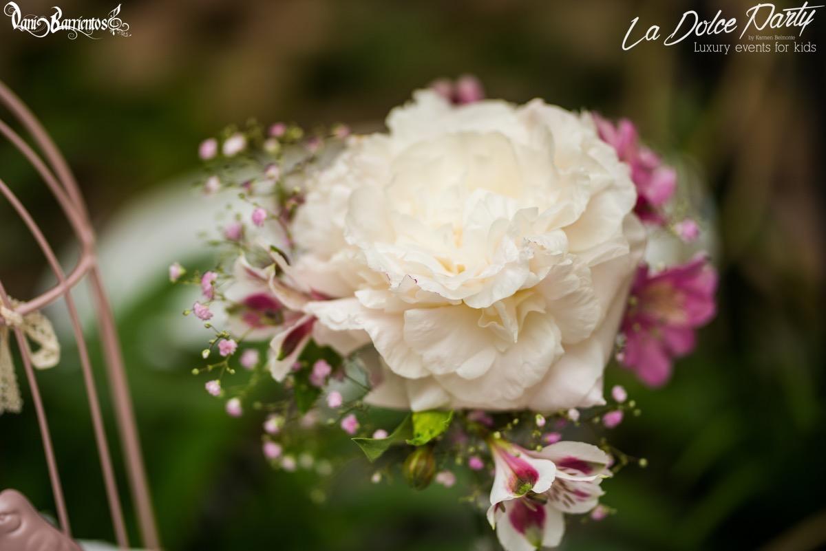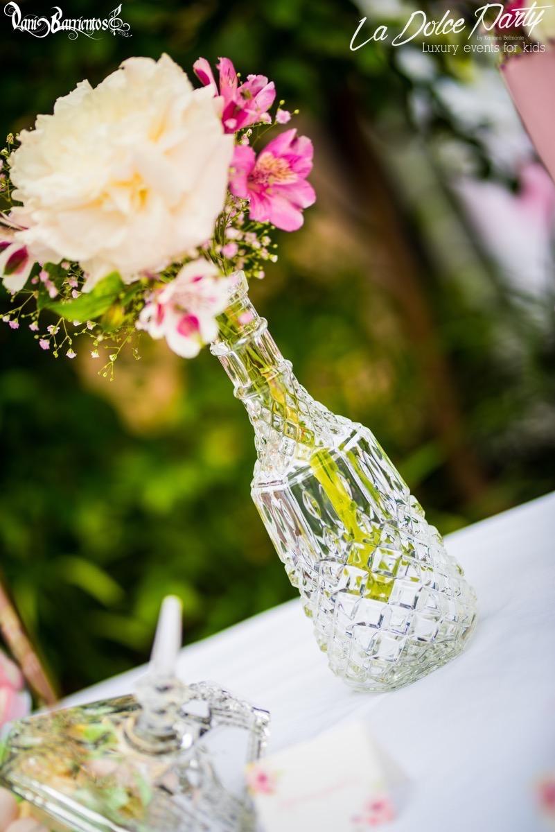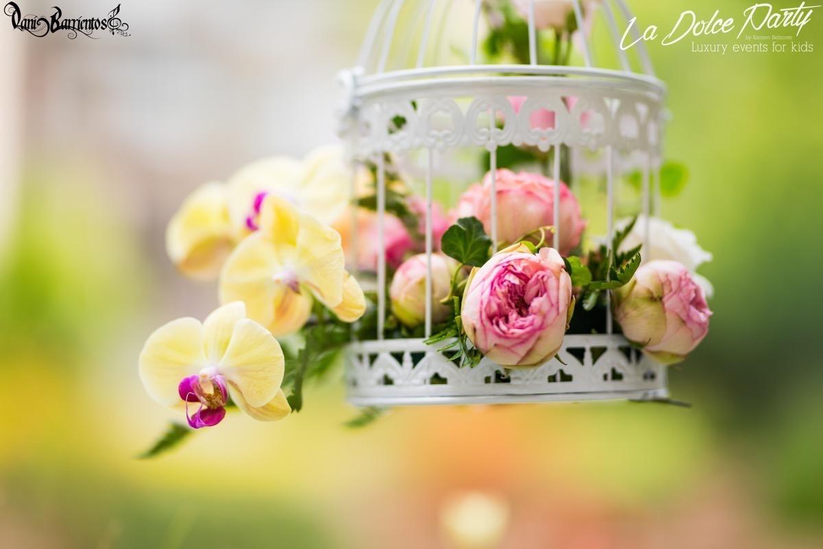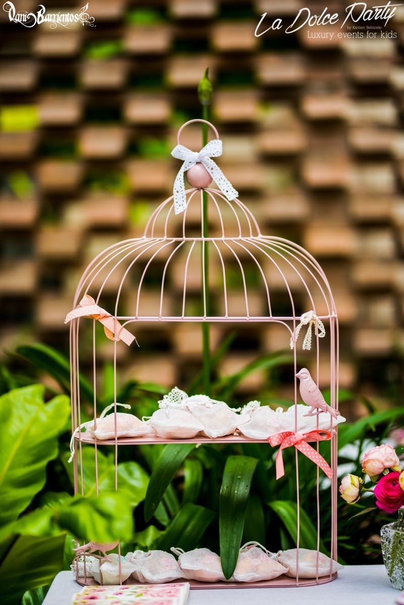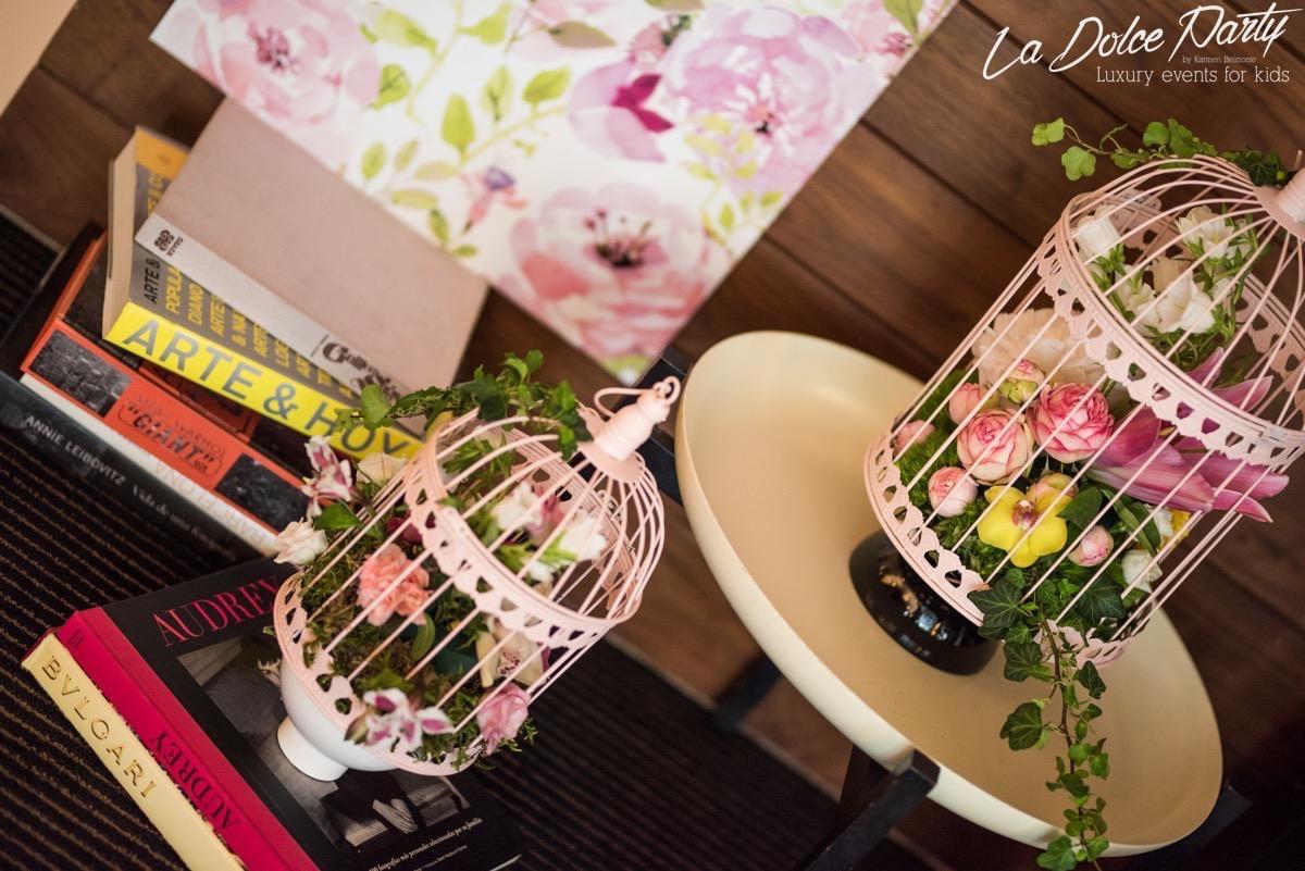 Los que me conocéis sabéis de mi debilidad por las flores naturales, y por supuesto, en esa garden party no podían faltar! Decoramos la mesa de dulces con unas botellas de licor brocadas de cristal, y los farolillos que habían encima de la mesa para que estuviera todo integrado. También hubieron adornos en las mesas de apoyo, unas botellitas de tocador con ….. y unas jaulas que colgaban del techo en la mitad del jardín. Simplemente espectaculares.