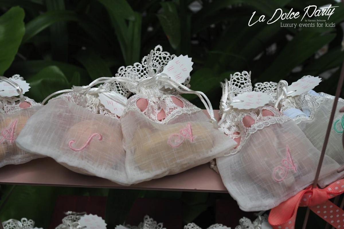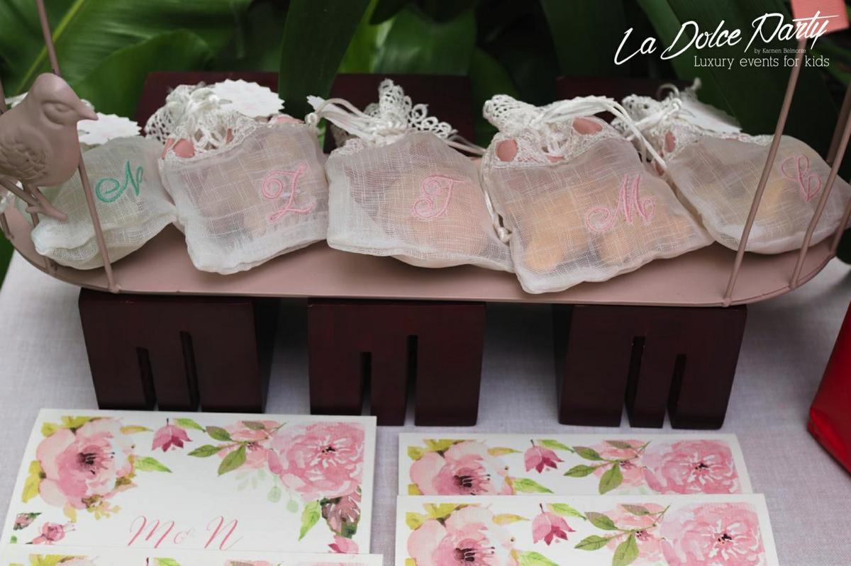 Detallitos para los invitados? Fueron un acierto total! La debilidad de los papis por la colonia de Bvlgari, fue el punto de partida para elegir los regalitos para los niños invitados. Unos jabones de Bvlgari en unas bolsitas de organza con entredós y la inicial bordada de cada niño en tonos rosas y verdes fueron los detalles elegidos y que enamoraron a todos. Para los adultos, se eligieron unas fotos de las niñas, que quedaron así de bonitas