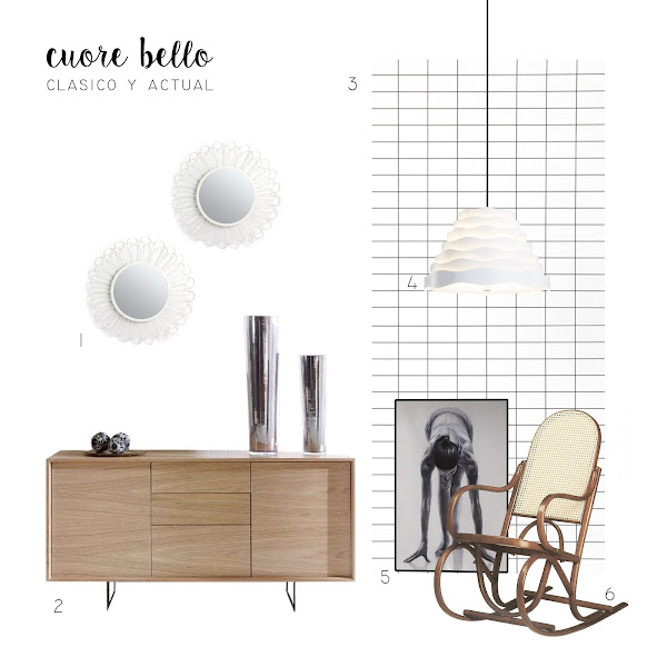 1. Espejo Aldan / 2. Aparador Scandinavia / 3. Papel de pared GRID de Ferm Living / 4. Lámpara Boira / 5. Cuadro "Equilibrio" / 6. Mecedora de madera curvada