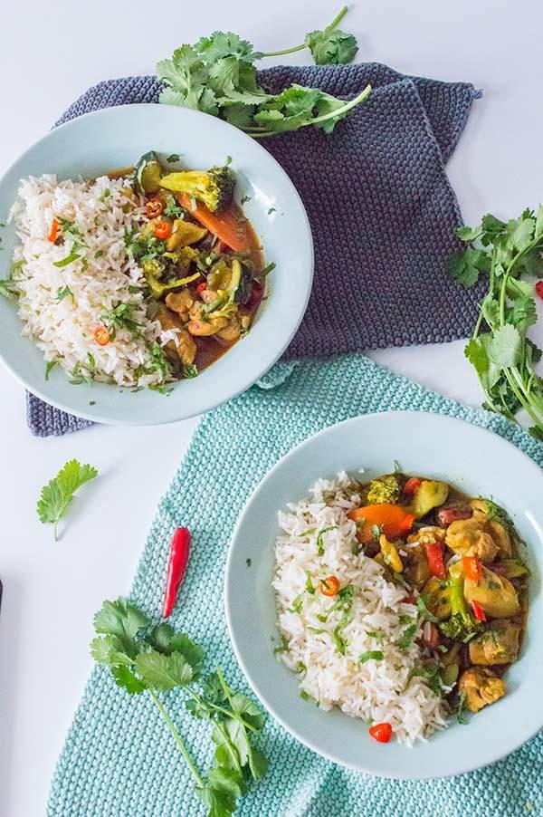 Servimos inmediatamente junto con arroz basmati, cilantro fresco y la guindilla cortada finamente.
