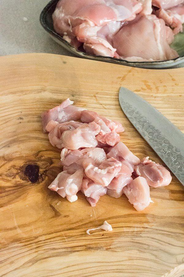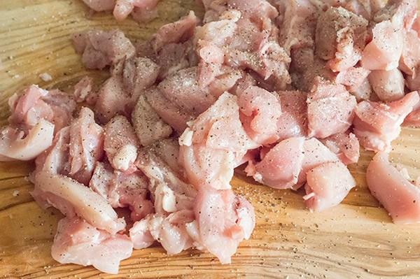 Mientras se rehoga la cebolla cortamos y salpimentamos el pollo.