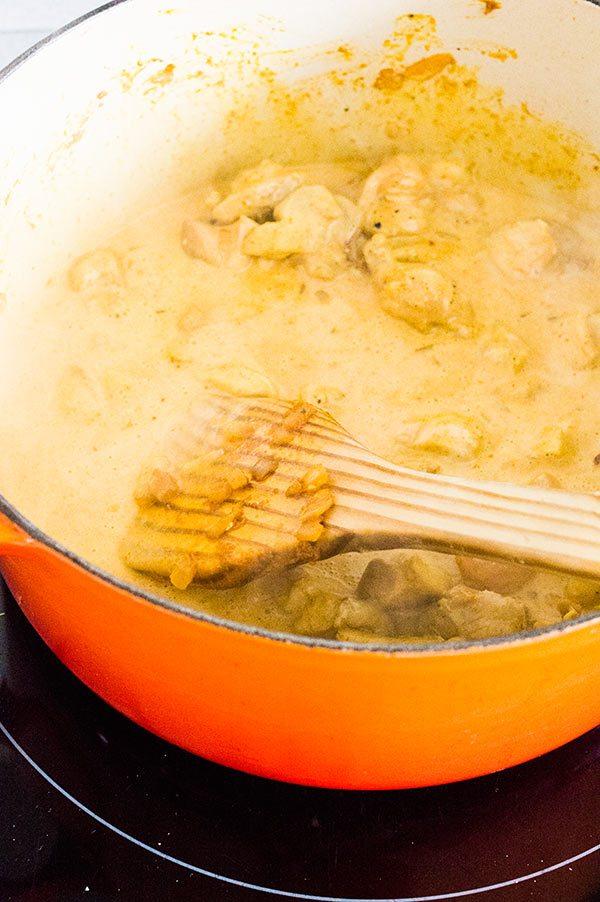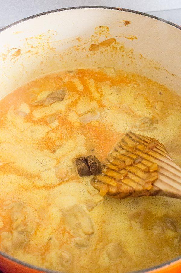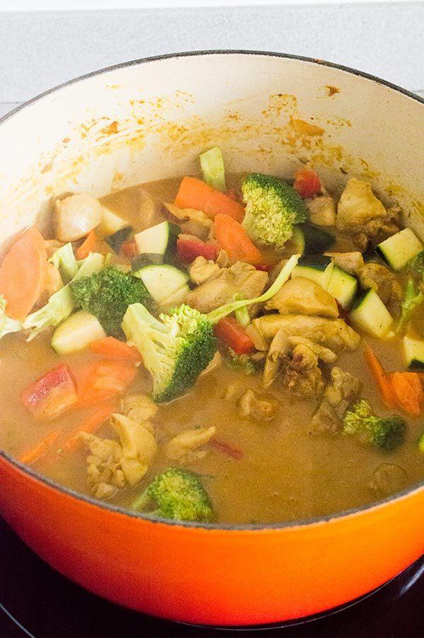 Añadimos la leche de coco y la misma cantidad de agua al guiso, junto con la pastilla de caldo de verduras. Dejamos cocinar durante 10 minutos.