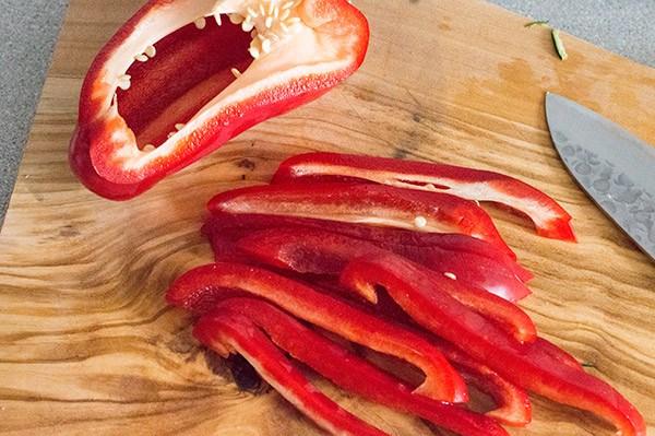 El pimiento rojo en tiras.