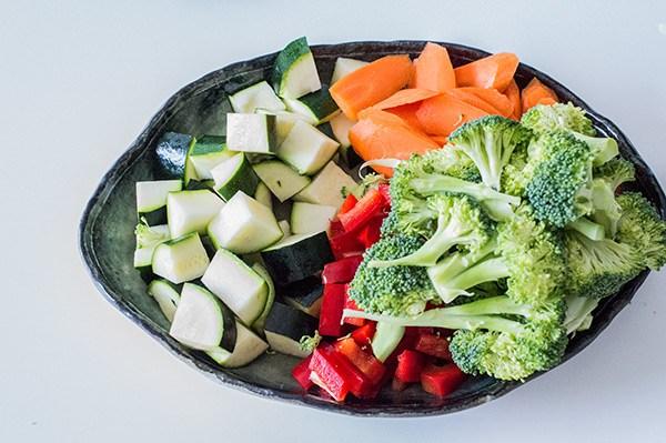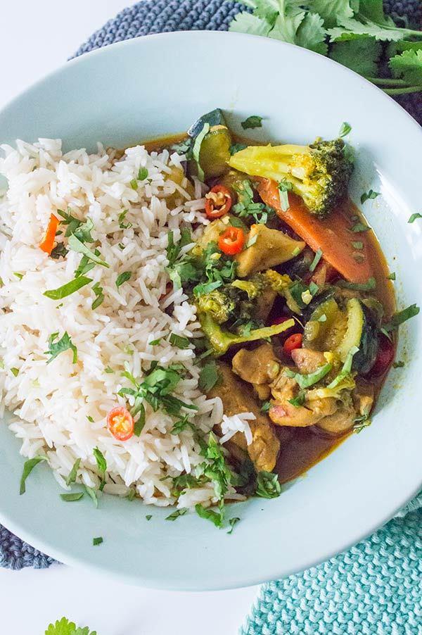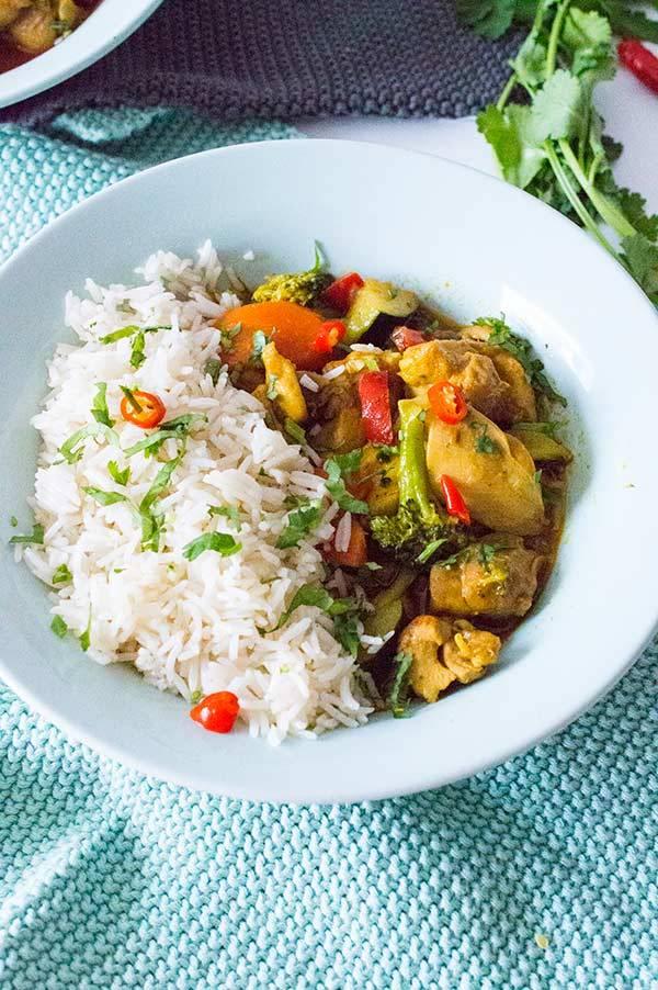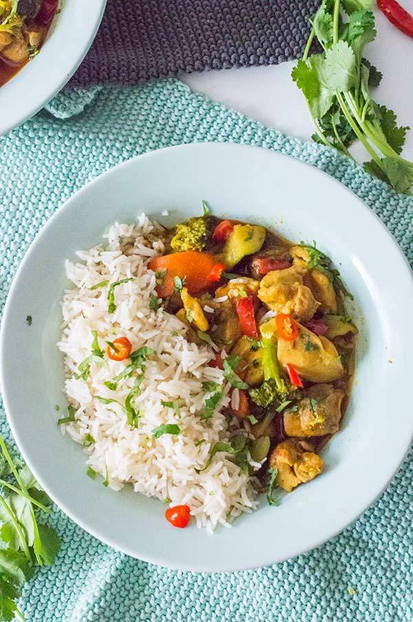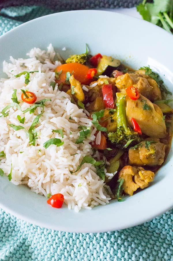 Podéis usar las verduras que mas os gusten por supuesto, yo he usado brocoli, zanahoria, pimiento rojo y cebolla… la verdura colo hay que cocinarla unos 7-10 minutos para que no se haga demasiado y quede un poco crujiente… Esta receta es fácil de hacer y muy rápida ya que en 20 minutos tenemos un guiso de pollo y verduras en toda regla, super completo y reconfortante.. Lo he servido con arroz basmati que es perfecto para este tipo de platos y que ademas recoge la salsa de maravilla!