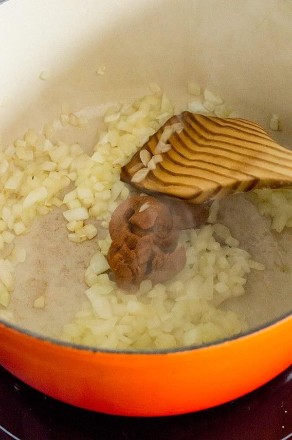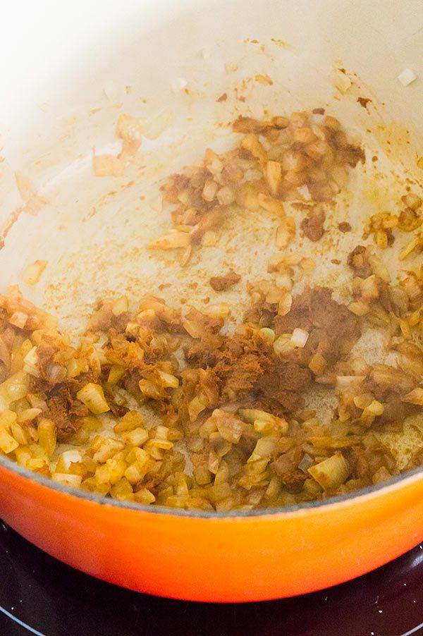 Añadimos la cebolla y sofreímos a fuego medio. A continuación añadimos la pasta de curry amarillo.