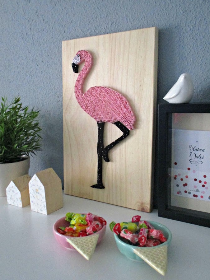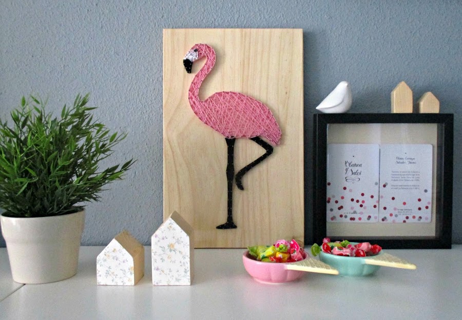 Hacer hiloramas es algo que me relaja bastante y que me entretiene mucho, y después de un mes bastante ocupado pues el cuerpo me pedía algo así. También me pedía irme a un spa y disfrutar de una playa paradisíaca pero mi cuenta corriente no decía lo mismo ajajaja. En esta ocasión me apetecía hacer algo que cuando lo viera me recordara al verano, algo fresco, y no se porque lo primero que se me vino a la cabeza fue un flamenco. También pensé en mi mujer porque tenía que ser algo que nos gustara a los dos, aunque de primera hora ella no estaba muy convencida de que quedara bien, pero cuando lo vio terminado esta claro que sus dudas desaparecieron.