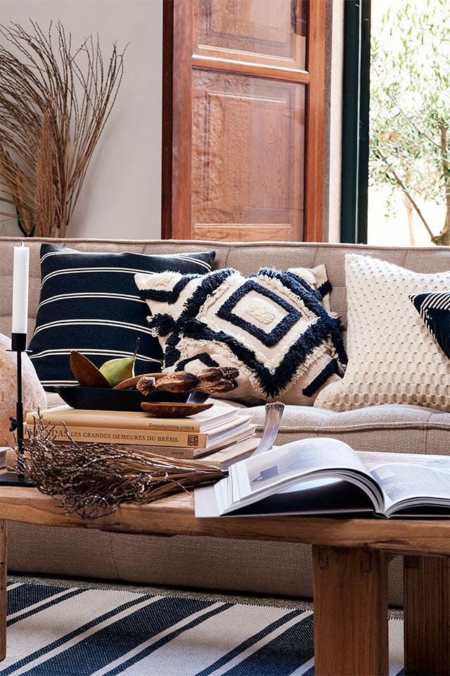 Inconfundible el estilo con esencia mediterránea de Calma House, en cojines, alfombras, ropa de cama… se pueden encontrar ahora hasta con un 40% de descuento.