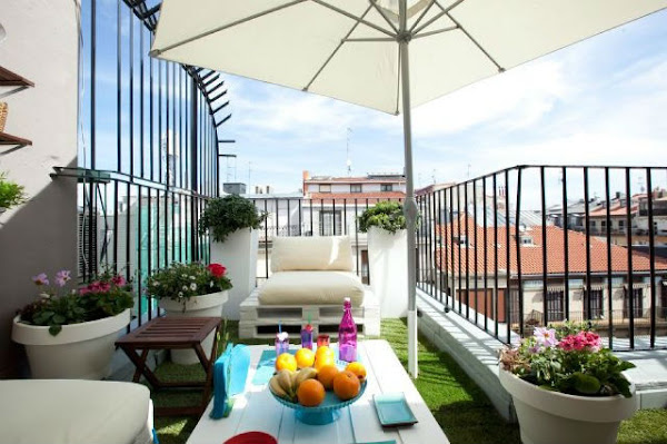 Poniéndo una buena base, ya sea en suelo o colgada de la pared, nos dan la rica sombra vital para disfrutar de la intemperie durante el día. En este balcón se lo han currado de lo lindo. Han hecho los muebles con palets, colocado césped artificial, unos cojines bonitos, y varios maceteros grandes. ¡Y tan bonito!