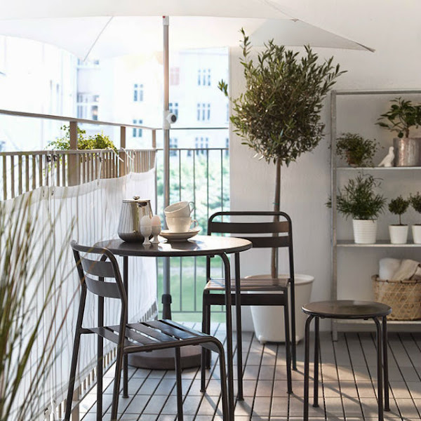 Las estanterías metálicas son un recurso económico con el que seguro que puedes hacer una composición chula. Aquí han añadido una estantería que bien sujeta a la pared deja espacio para plantas de todo tipo. En el suelo un composite que se parece a la madera, pero no te va a dar ninguna faena porque es de plástico. Y para rematar una mesa sencilla con dos sillas que preferentemente sean apilables. ¿Y la sombra? De nuevo, la sombrilla de la playa. ¡Vaya vaya!