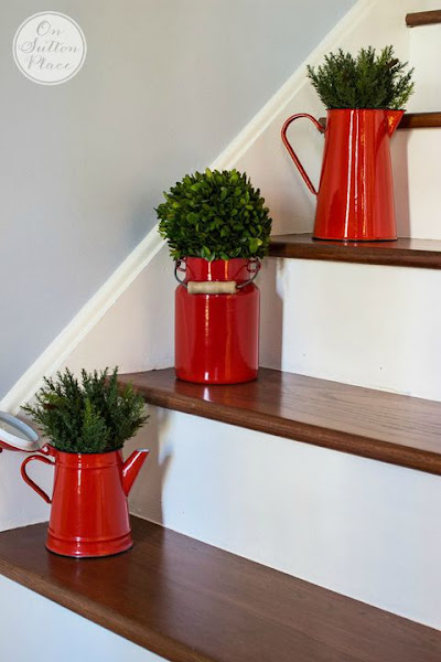 Para una decoración navideña para la escalera simple y colorida, agrega jarras rojas con ramas verdes en los peldaños.