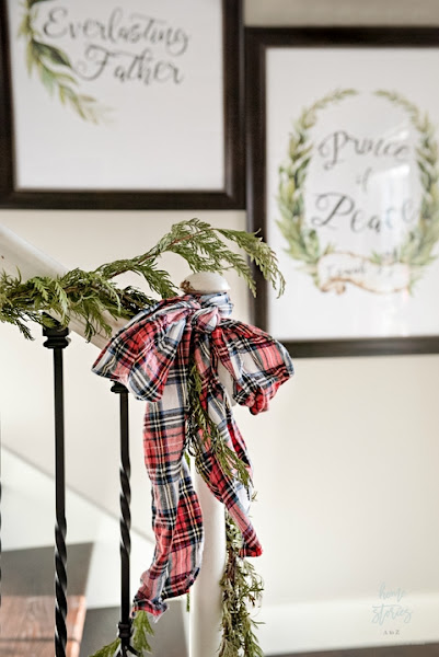 Haz un moño con una cinta roja a cuadros en el pasamanos de la escalera y decora con algunas ramas de pino.