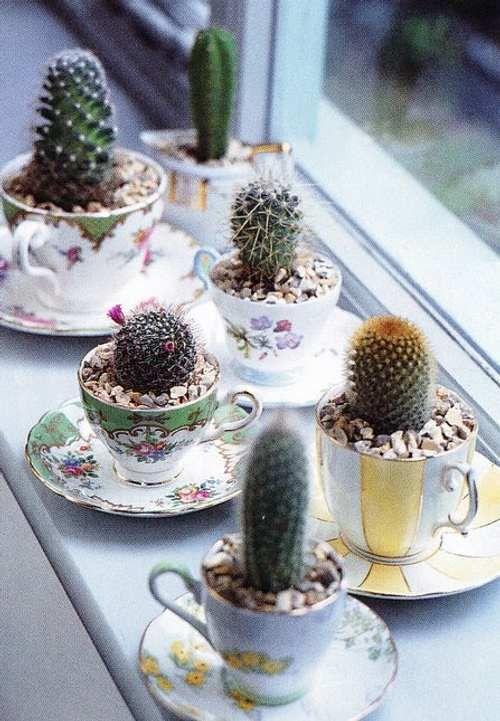 Si te apetece crear algo divertido y original, una buena idea es usar recipientes creativas para plantar tus cactus. Estos pueden ser latas recicladas, porcelana o cualquier otro tipo de recipiente que tienes por casa.
